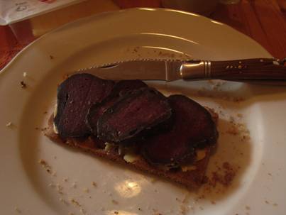 Sieht seltsam aus und schmeckt auch so. Musksalami (vom Moschusochsen)